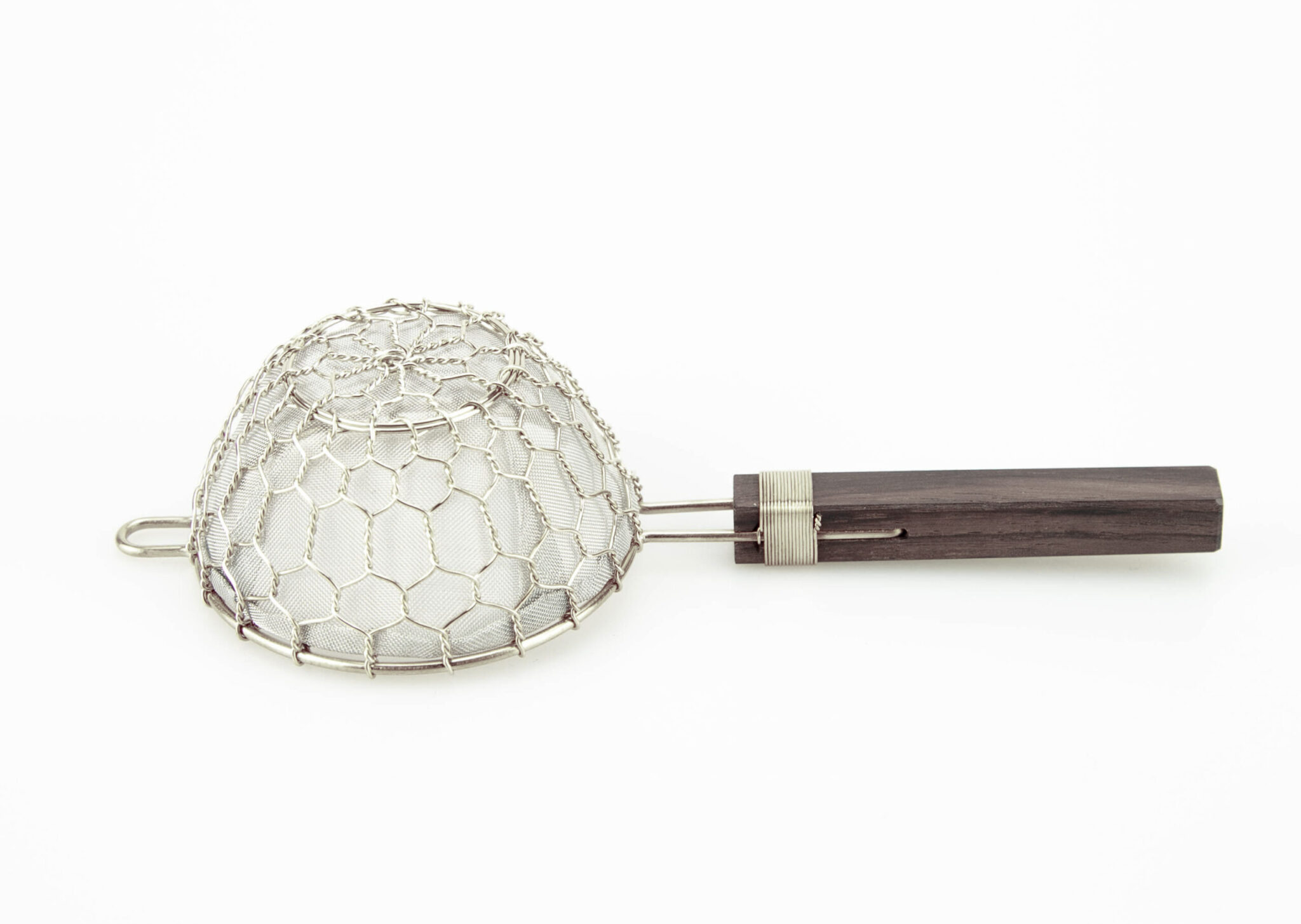 The strainers are formed by the skilful craft of hand knitting copper wire to make the shape and finished with stainless steel mesh and a rosewood handle. Although these are designed as strainers, they can also be used as an infuser for making tea in a shallow cup or as a sift for matcha tea.