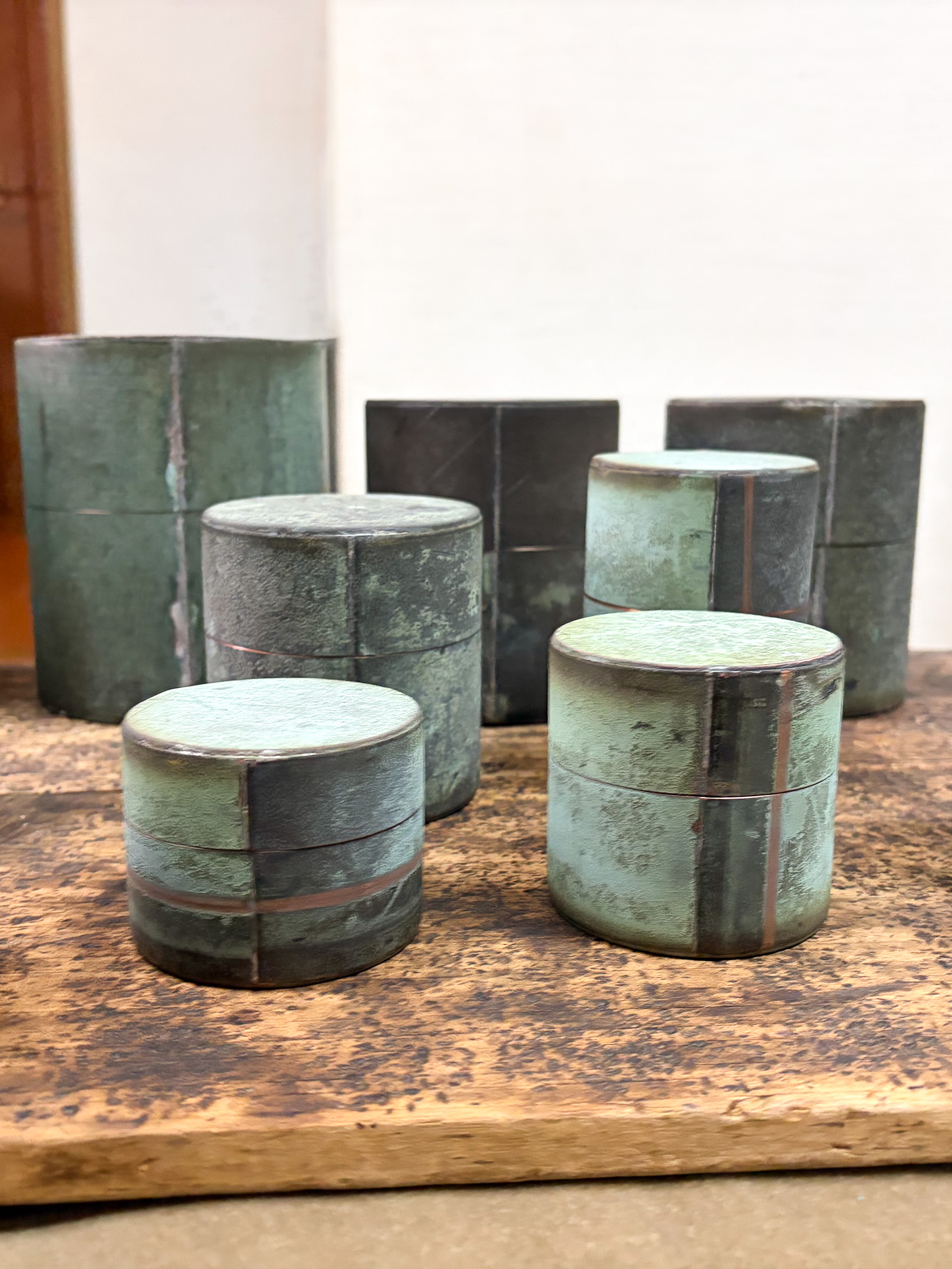 Verdigris is a word for the colour of the patina that forms on copper or brass. It is thought to come from the French term ‘vert-de-Grèce’ which refers to the beautiful green on classical Greek bronze sculpture. In this new series of caddies, Takahiro Yagi has used weathered copper from an ancient Japanese shrine where the roof was being replaced. Using this material from the earth but marked by the heavens for around 100 years, he has created objects which have incredible power but also a purpose. Come and meet Takahiro, one of the people most responsible for the revival of craft in Japan over the last 20 years and the sixth generation of iconic Kyoto tea caddy company Kaikado on Friday May 8th from 5-7pm and on Saturday May 9th from 3-6pm. During these times we will also be serving verdigris financiers by Suzue Aoyama and ambient green tea. Please note that the exhibition continues on Monday May 11th and Tuesday the 12th, but Taka will not be at the shop on either of those days.